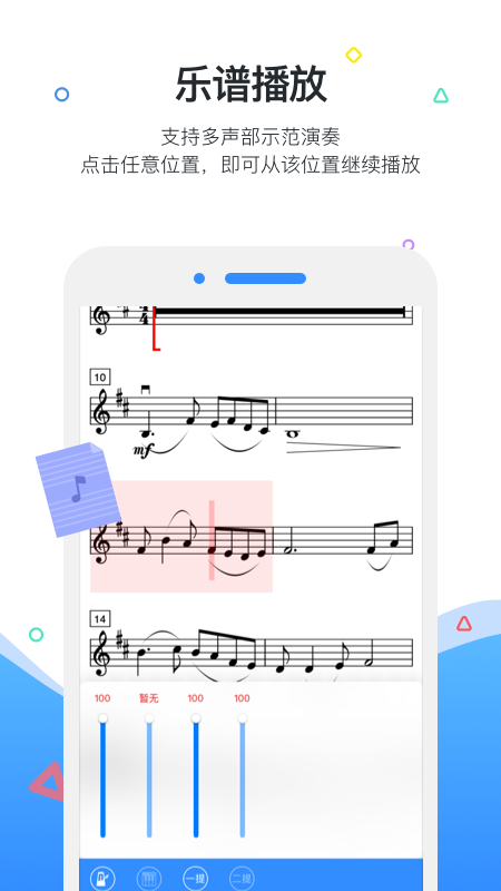 - 练习该乐曲。本应用将识别琴声,并在演奏过程中在乐谱上光标指示当前进度。