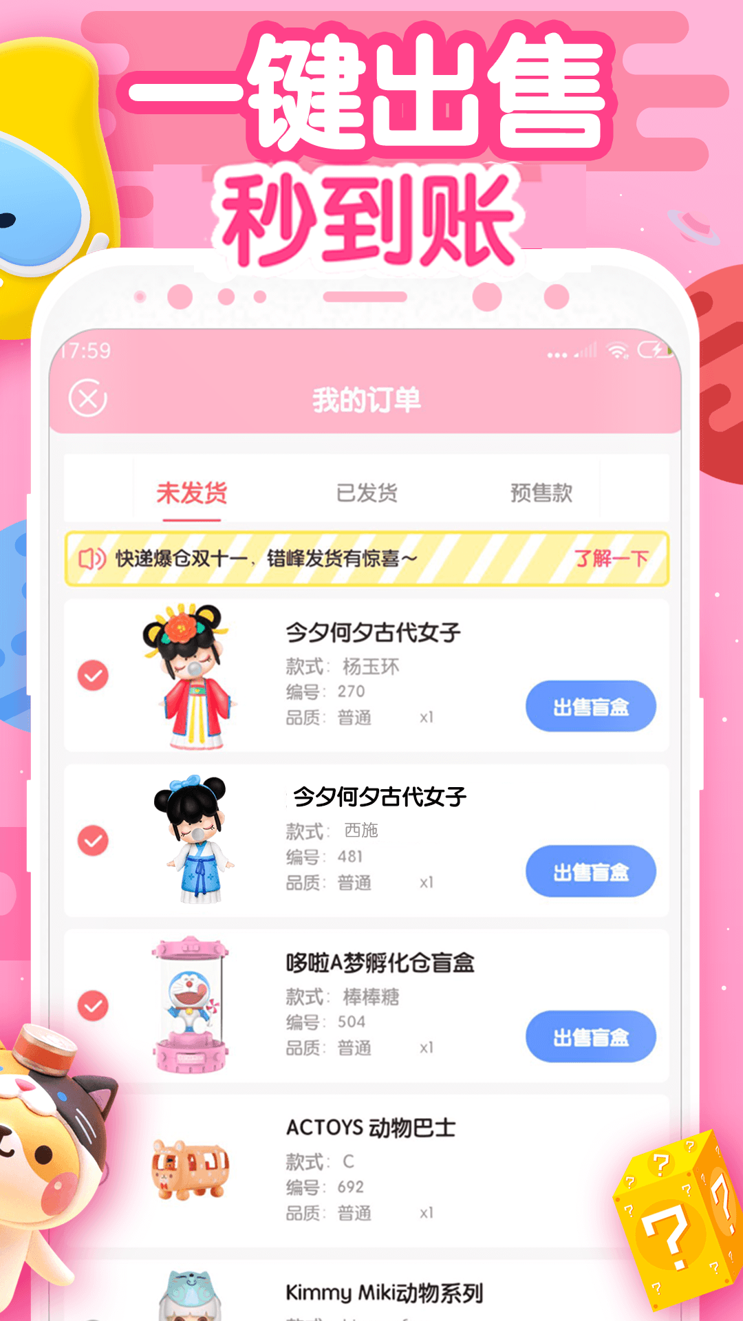 在这里,我们为您精心准备了数百款盲盒,丰富多样的道具,更有平台内一键出售的便捷服务,让盲盒的购买过程变得更加~~