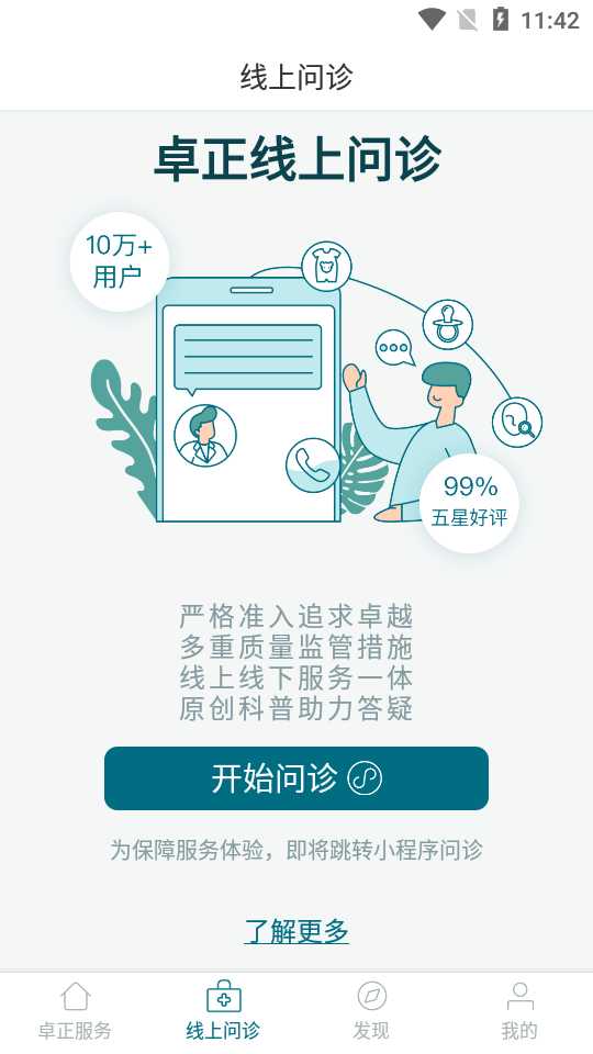 卓正医疗app,乃一专业的线上医疗服务平台。覆盖全国11个城市,汇聚200余名专业医生,提供24小时预约就诊及线上问诊功能,以患者为中心,全方位呵护您的健康。