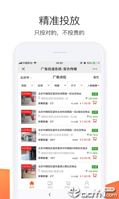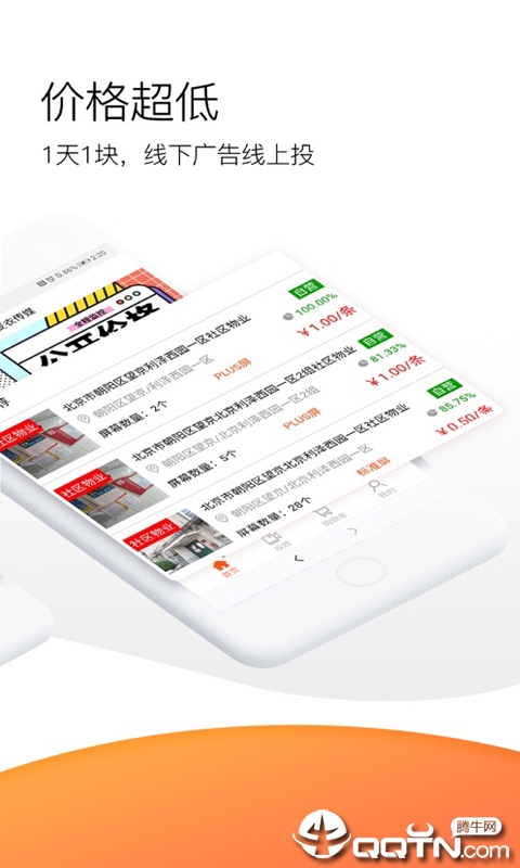 线下广告,线上投放。广告主可自由选择任何广告包进行线上下单,