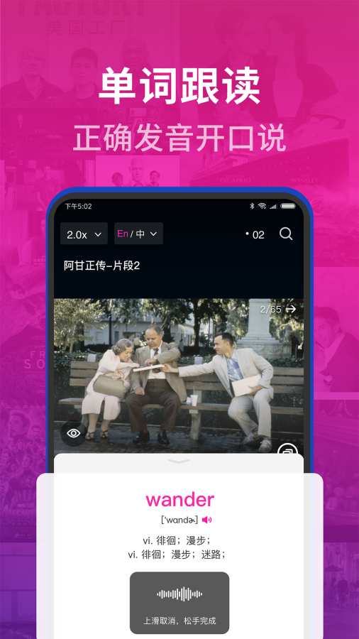 用户可以随时在线学习英语,应用提供字幕翻译功能,同时每日进行口语练习,心动不如马上下载使用!