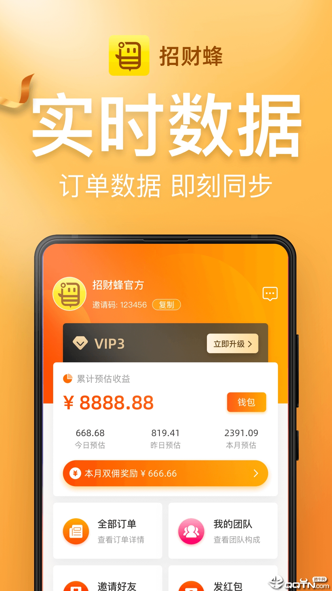 2. 在APP个人中心点击邀请好友,将招财蜂的邀请海报直接分享给朋友,他们通过您的海报注册,您只需确保他们在APP购物或推广下级,便可终身获利!