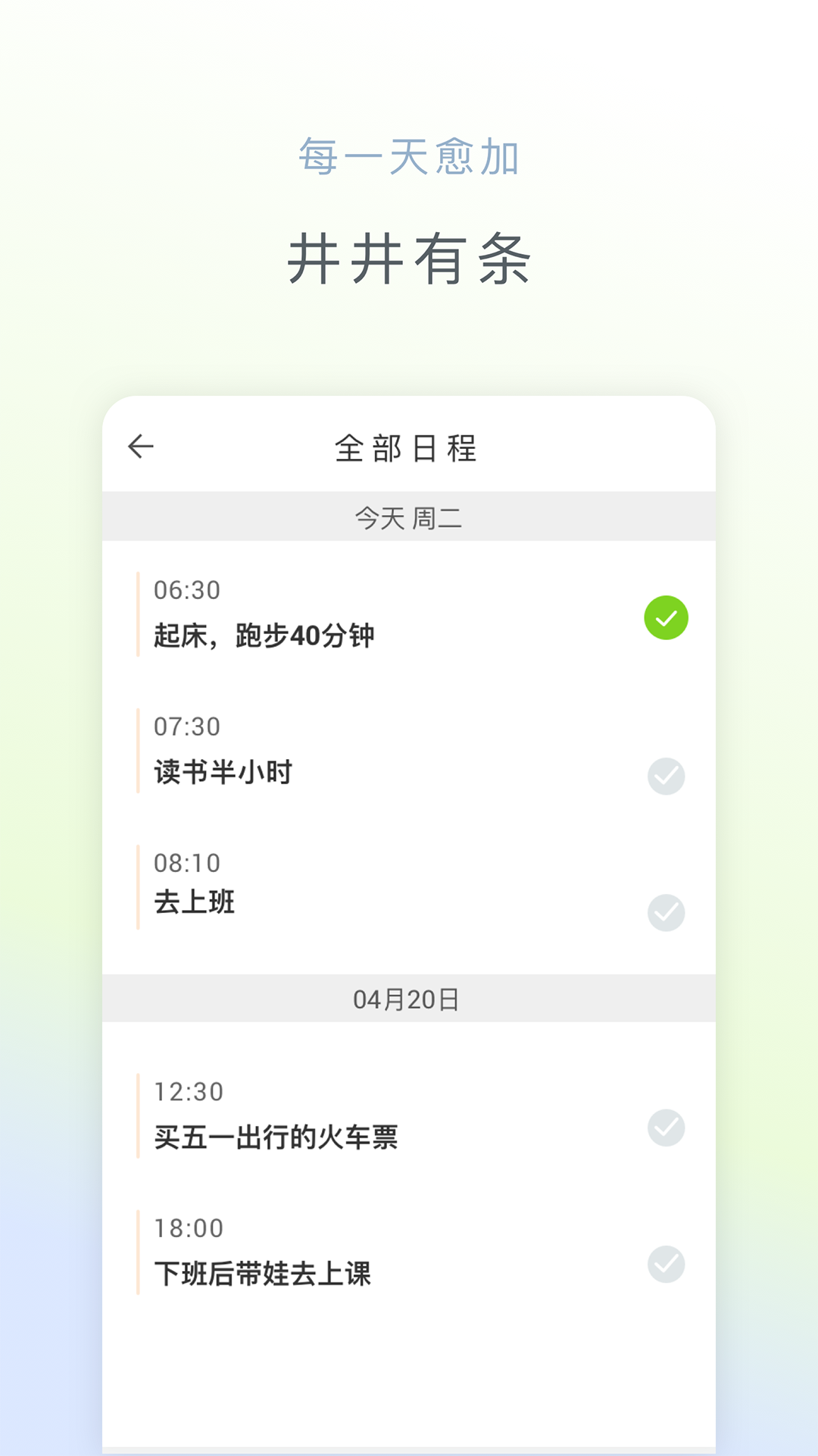 - 日程回溯,轻松检查每一天的计划完成情况,妥善了解和规划自己的工作。