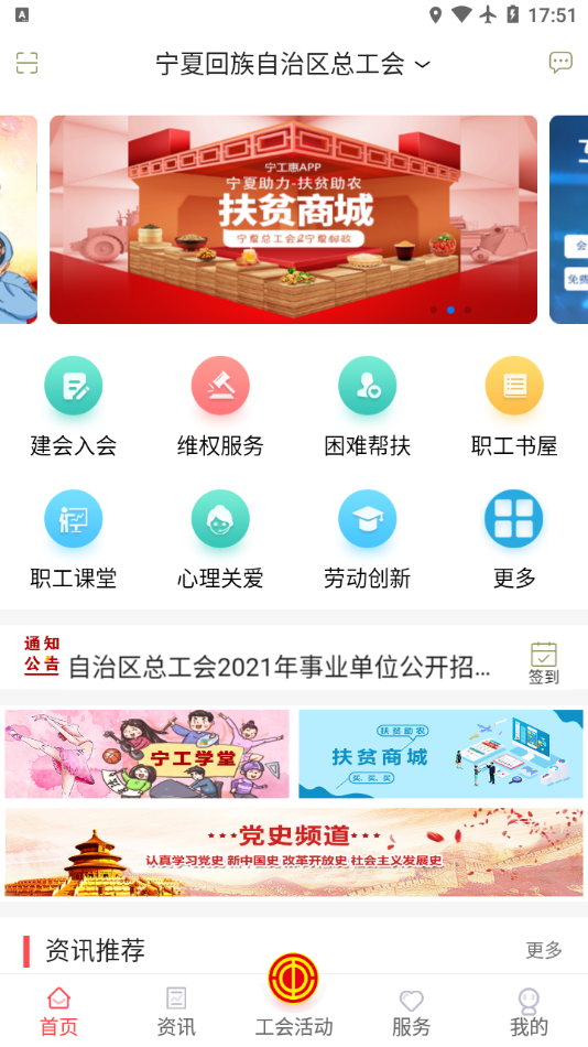 宁工惠app是宁夏总工会官方制作推出,软件拥有建会入会,困难帮扶,普惠城,维权站,就业所,劳动保护等功能服务,可以帮助工会会员更好地办理事务、享受生活。