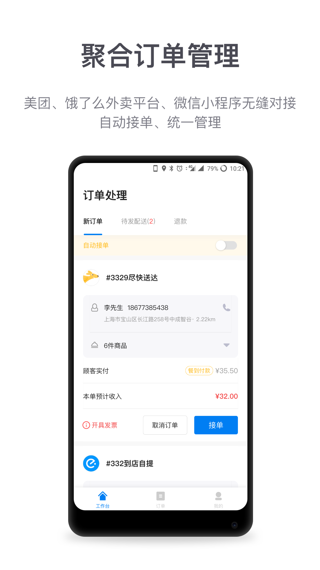 盟有管家是一款专业的外卖订单聚合平台,实现美团外卖、饿了么等多平台外卖门店和订单的统一管理,支持外卖自动接单、自动打印小票、自动发货物流配送,帮助商家更高效地处理外卖订单。盟有管家同时也整合了蜂鸟、达达等多方物流配送平台,支持商户自主选择物流配送方式。盟有管家,让外卖经营更智慧!