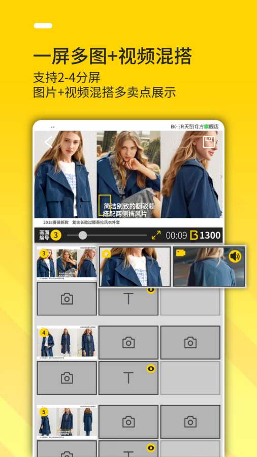 【一屏多图】:支持2分屏、3分屏、4分屏等多图多视频同时,个性卖点一目了然;