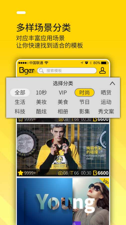 【视频模板】:Bger强大的模板系统将AE特效等专业表现视频编辑手法整合打包,任何人都能依照模板轻松完成视频制作与音乐相册制作,打造高品质作品,助力企业品牌推广与产品营销,同时为个人创作电子相册提供巨大便利;模板通用性极佳,只需替换素材,选取喜欢的背景音乐,即刻打造崭新风格的视频;