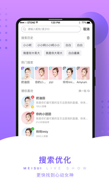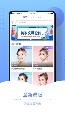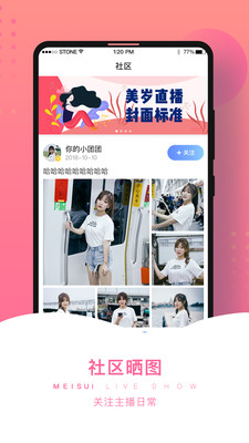 美岁App,是一座真人直播交友的芳园。这里汇聚了各路清新、可爱、呆萌、帅气的主播,等待着与您互动,更有礼物排行榜,守护您心仪的主播。赶紧下载,体验吧!