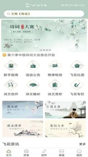 -好友系统与诗友圈:“飞花令”汇聚了众多诗词爱好者,您可以申请添加他们为好友或建立群组,和大家一起畅谈分享诗词与人生。