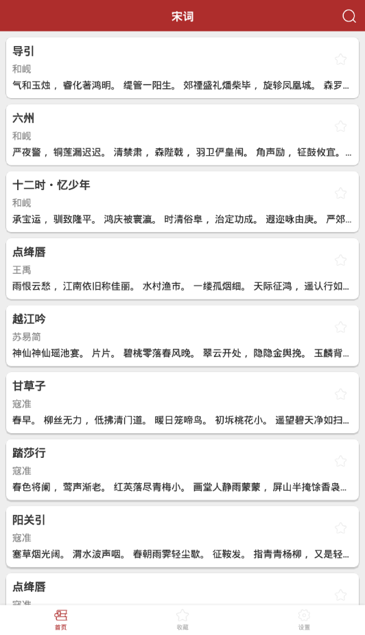 宋词伴读是一款拥有丰富宋词词库的学习类app,用户不仅可以在庞大的词库中搜索同名宋词,还可收藏佳句。