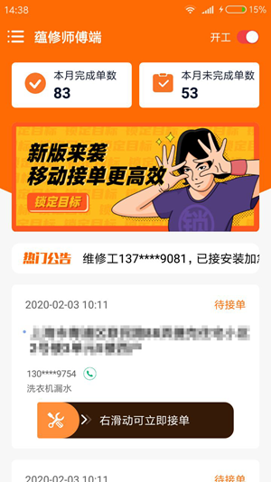 蕴修师傅端APP不仅是一款线上接单软件,更是您工作助手的理想之选。它不仅能帮助您轻松接单,还能详细分析每日的工作进度,查看客户的反馈信息,让您的工作更加高效便捷,实时处理订单操作,自由支配时间,订单接到手软。