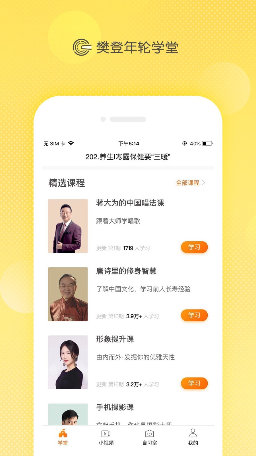 樊登年轮学堂APP,专为中老年人打造的学习与交流平台。致力于为中老年朋友们提供隔代教育、健康养生、花卉园艺、乐器技能等丰富课程的在线学习与互动,点亮生活,结识更多志同道合的良友。