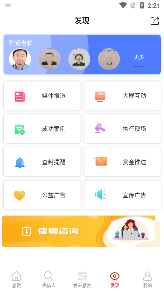 互动社区、老赖地图、续封提醒、担当、媒体互动、律师解答。