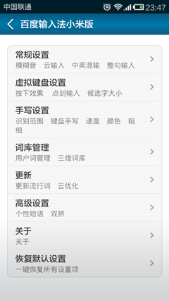 谈及四种输入界面模式后,我们再来探讨百度输入法小米定制版的相关设置功能。如前所示,直接点击设置即可进入输入法设置界面。