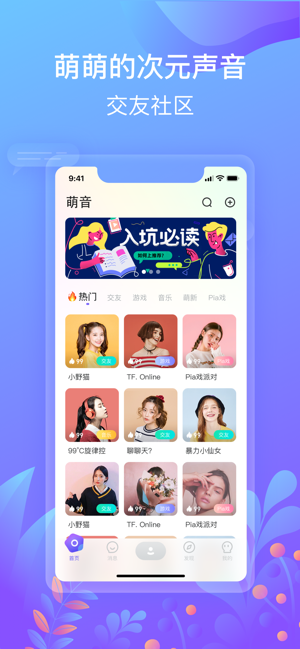 萌声交友平台,次元交友社区。、聊天室、游戏语音开黑尽在萌声,随时随地以声会友,用声音遇见心动的TA。感兴趣的朋友点击下载吧。