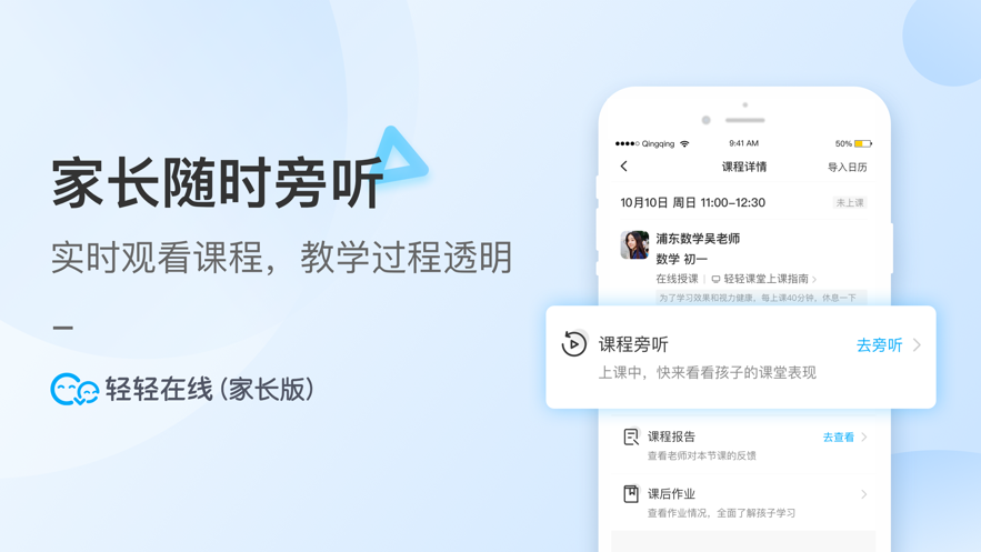 轻轻在线家长app下载,这是一款专为中小学生家长精心打造的辅助平台。通过轻轻在线家长app,您可以随时洞悉孩子的学习动态,更可在线旁听,若您有需要,欢迎下载体验。