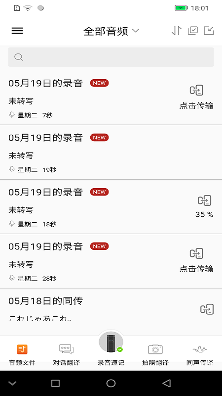 连接设备后,将设备接收的语音实时传输至APP,转写为文字。支持外部导入多国语言进行文字转写与翻译。