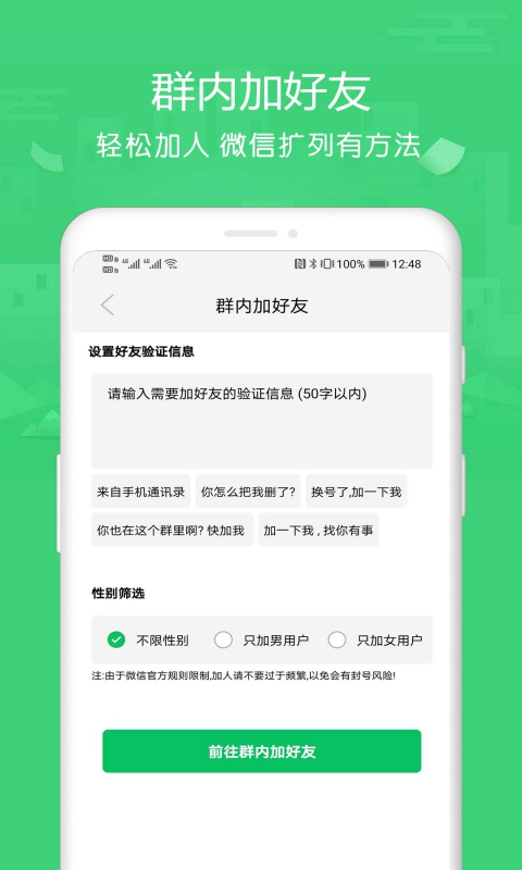 群资源应用下载,一款强大实用的群组资源助手软件,通过群资源应用广大伙伴可以更加轻松便捷地拓展业务和吸引客户,全新加粉神器更加高效,如需请即下载。