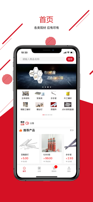 筑材通APP,首页汇聚各类建筑材料,琳琅满目;商品列表,品类繁多,搜索便捷;分类详细,助您快速查找;商品详情,信息详尽,便于快速浏览。