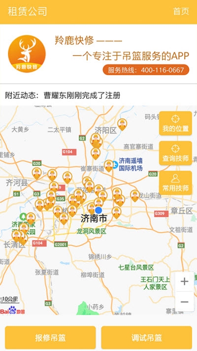 吊篮公司可以通过地图实时查看附近的维修技师,也可直接在地图上点击维修工联系电话进行报修。