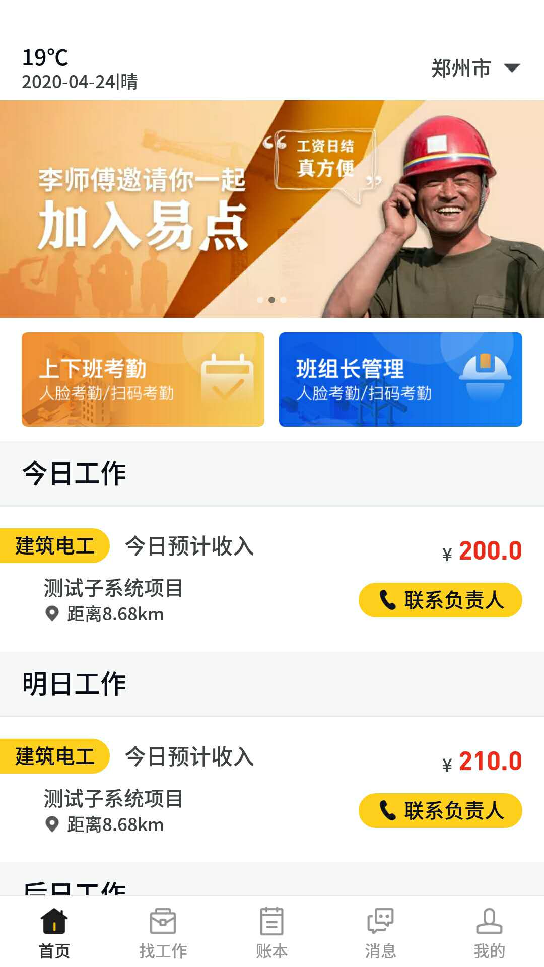 易点天工是一款为建筑行业工人提供找工、上工、工资管理服务的APP。