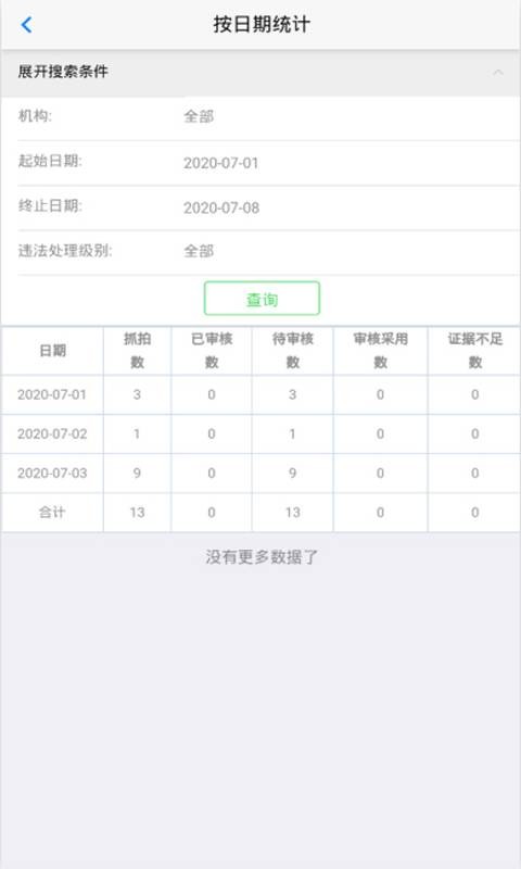 湛达智能应用程序提供按时间、机构、车辆及违法处理级别等多种类型的统计报表。