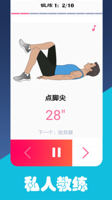 免费的私人健身教练为您全身的主要肌群提供了每日的锻炼计划。每天只需花费几分钟,您便可在家中完成肌肉锻炼,塑造理想体型,无需前往健身房。所有的均可依靠自身重量完成,无需任何器械或健身教练。