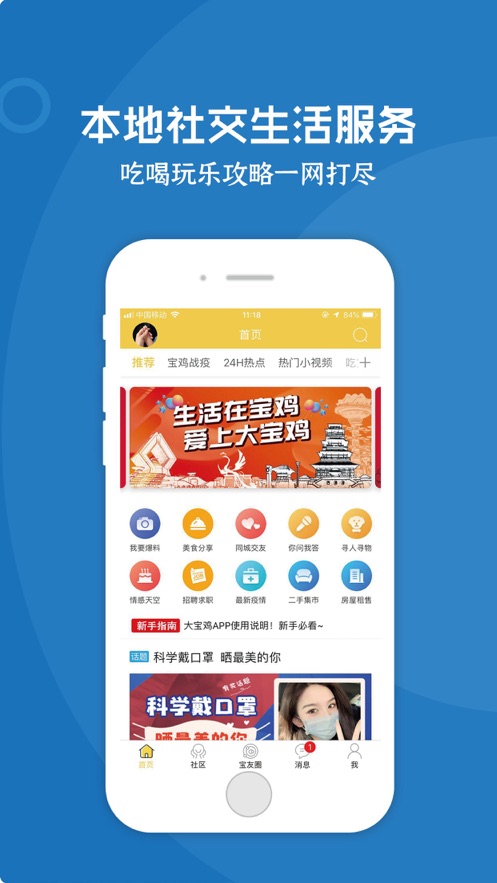 大宝鸡APP是宝鸡本地备受欢迎的社交平台,涵盖了宝鸡的美食、娱乐、、热点资讯、生活服务及线上线下活动等多种功能。