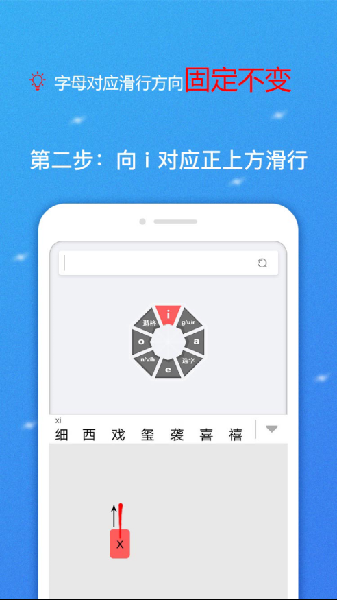 字母对应的滑行方向始终如一,第二步:向i的正上方滑动