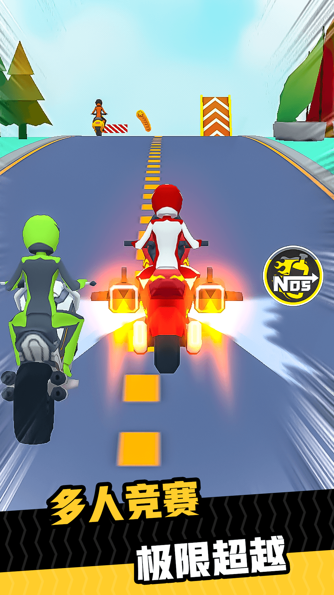 操作简单,控制摩托车的前进与后退,以及中心的前后移动即可。然而,要想获取赛道上的加速道具并避免他人的干扰,则需玩家不断磨练自己的手感。