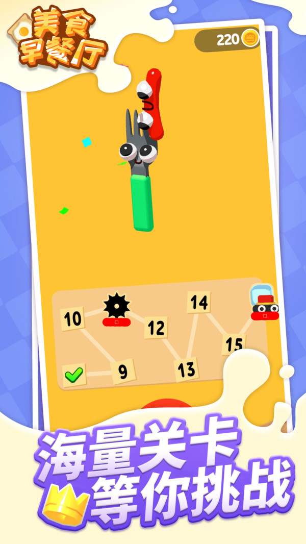 《美食早餐厅》是一款融合了物理谜题操作的闯关手游,玩家需运用叉子,在每个关卡中成功叉住香肠作为目标,并通过不同技能击败更高级别的对手。你能成功叉住你的香肠吗?来测试你的技巧,挑战所有关卡吧!