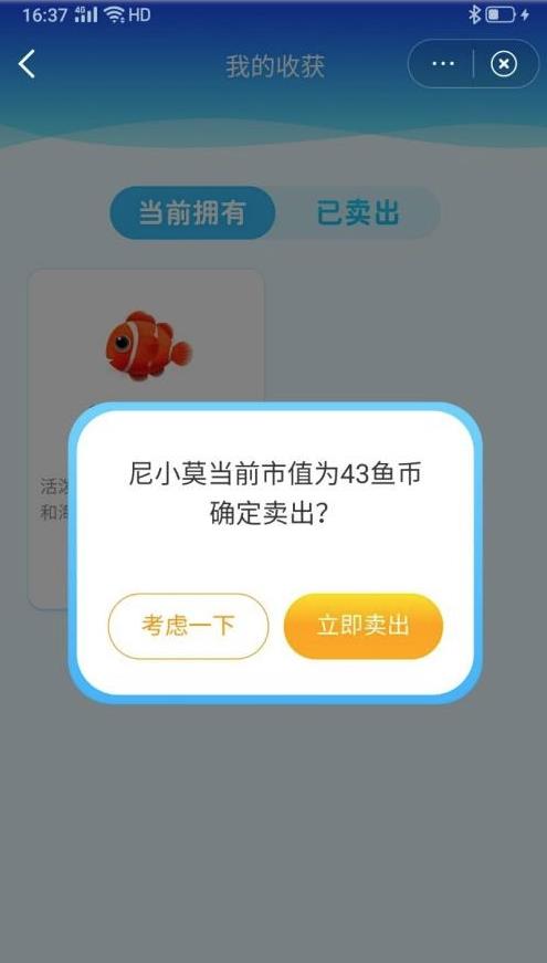 4、接着,点击“立即卖出”,然后稍安勿躁,先选择“点收下”。在“开心收下”下方的“转发微博”左侧,取消勾选,再点击“开心收下”,如此便不会将卖鱼的消息转发出去了。