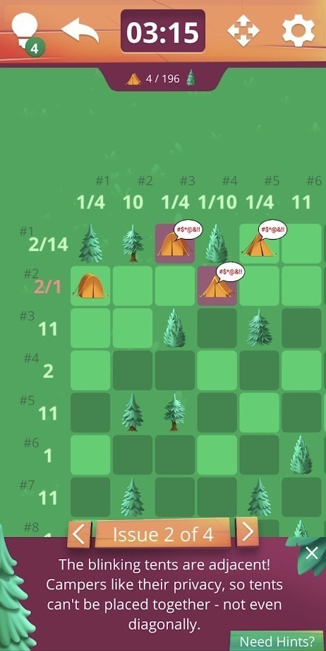 Real Tents是一款休闲益智类游戏,玩家将在此游戏中通过灵活移动帐篷以获得胜利。善用身边的帐篷与树木,将它们置于合适的位置,游戏设有计时功能,时间越短,得分越高哦。如果耗时过久,即使顺利通关也仅能获得一星的评价。