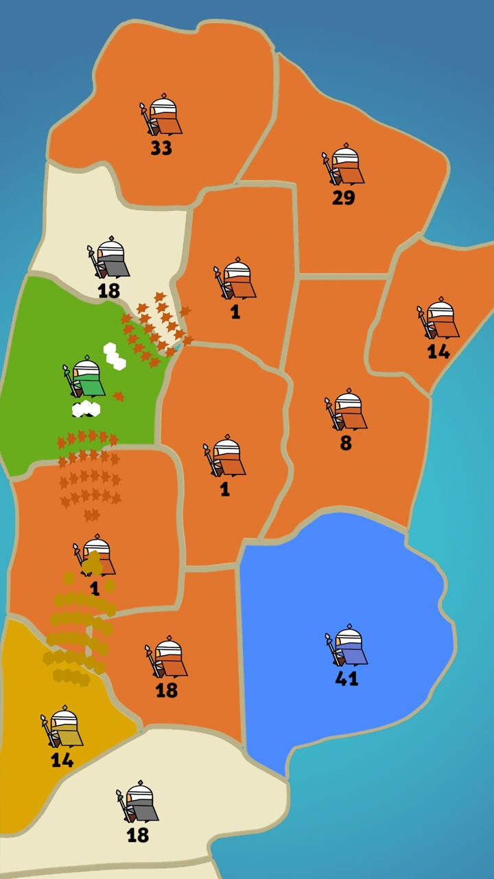 2、游戏初期,玩家将拥有少量已占领的领土,源源不断地生产士兵,通过积累兵力与对局势的精准判断,在保住已占领领地的同时,合理出兵攻占敌方领土。