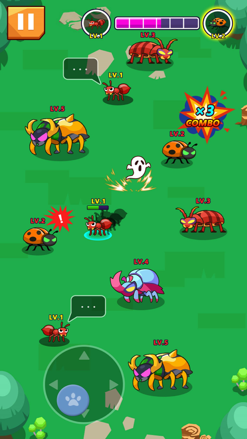 3、游戏中,您将从最低级的蚂蚁开始,不断吞噬与您等级相同或低于您的虫子,进化为更高等级的虫子。