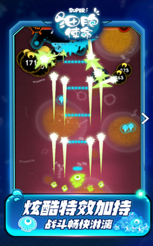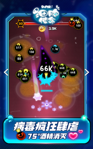 2、在消灭病毒与细菌的过程中,会掉落各种道具和加成BUFF,拾取这些道具,将使战斗力迅速飙升。