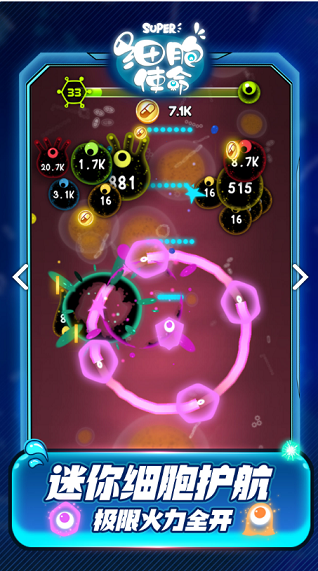 仅需滑动屏幕,即可操控呆萌细胞进行移动与射击,消灭侵入病体的病菌;