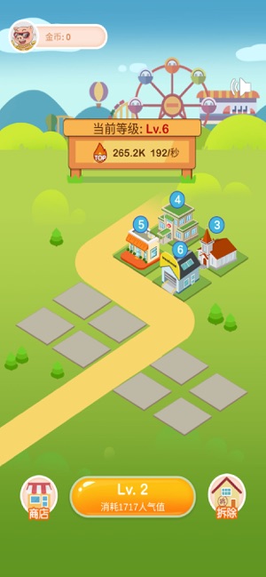 2、玩法,通过金币来建造建筑,提升建筑物的人气值即可获得丰厚的金币回报;