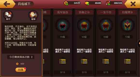 “”共有十四个关卡,只有击败当前难度下的所有士兵与武将,方能顺利通关,接踵而至的是更高难度的挑战。难度越高,击杀后所获得的威望及其丰厚的奖励便愈发丰富。每日可挑战一次,若成功通关,则可刷新挑战次数,每日还有机会使用元宝再次获取一次奖励,性价比极高,而充值次数将在凌晨五点进行刷新。