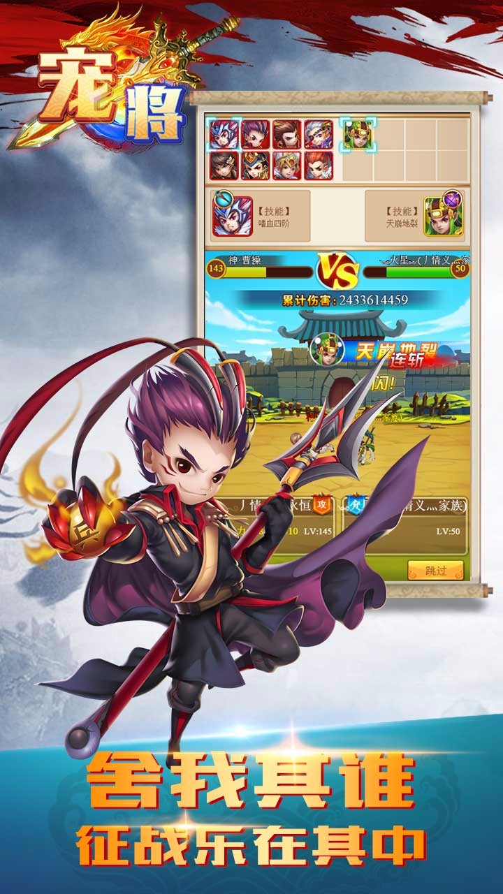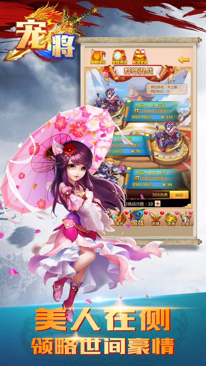 2018年备受瞩目的Q版三国《宠将》卡牌RPG休闲,三国武将任君选择,知名战阵随心搭配,倾世美人伴您左右,神州各地任您征服,轻松休闲中尽享嗨翻天的快感。坐镇军中,便可攻城略地,成为主公,方寸之间尽显沙场神威,超炫酷特效与武将、美人、神兵、坐骑,让玩家真实体验成为主公的无上乐趣。
