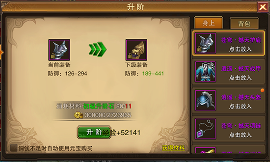3、升阶可将装备提升至下一阶,每次升阶将装备的可穿戴等级提高10级,使其属性更为强大。