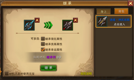 7、继承功能允许将一件装备的强化属性、洗炼属性与幸运属性传承给另一件装备,但参与继承的装备必须为同职业同部位。