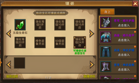 6、镶嵌则可为装备嵌入宝石,装备强化等级越高,可开启的宝石镶嵌孔也越多。