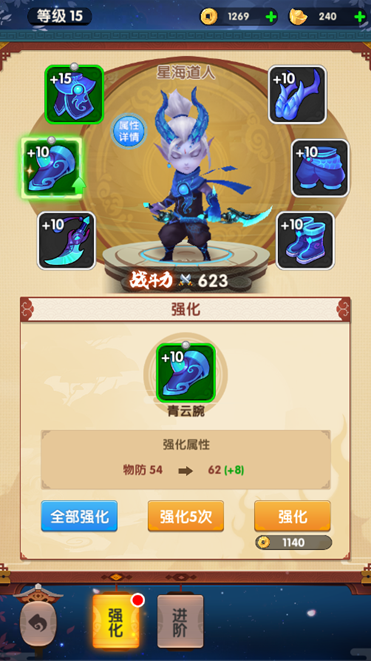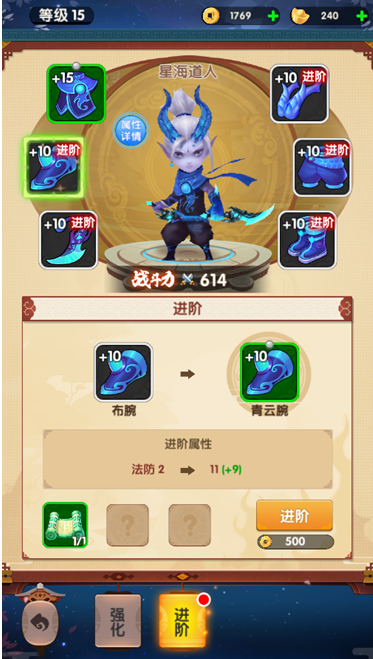 当装备提升至一定等级后,可消耗图纸与进阶材料进行“进阶”;