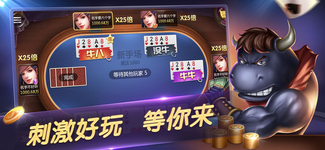 血拼斗牛,刺激非凡,乐趣等你来体验。更加真实的线上斗牛棋牌游戏,以百分之百的还款机制呈现刺激的斗牛场景,真人对战更显灵动多变,令游戏的可玩性如虎添翼!