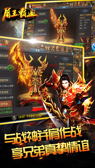 千秋霸业,尽在屠王。《屠王霸业》的震撼征战画面与引人入胜的故事情节使得整个游戏生动而富有魅力,拒绝单调乏味,倡导生动与刺激。同时,还有丰富多彩的活动在等待着你,快来与我们共同战斗吧!