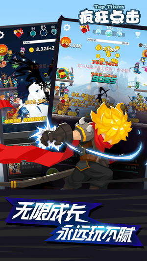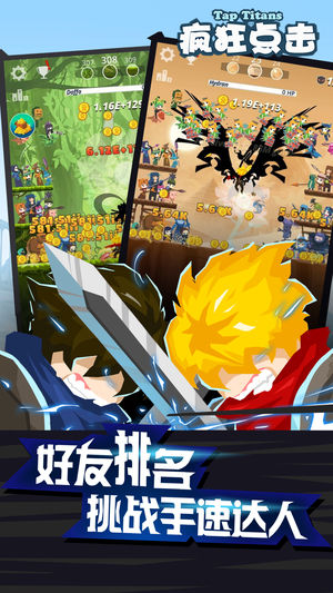 疯狂点击(Tap Titans)是由互娱与腾讯游戏独家合作运营的年度热门新游,作为虐手放置类游戏的佼佼者,绝对是您不容错过的必玩之选。砍怪兽、刷精灵、与好友展开排行争霸;集结神器、秒杀Boss、招募佣兵闯荡天下。快来加入我们,运用英雄的力量,打造属于您的佣兵团,与魔王展开殊死搏斗!