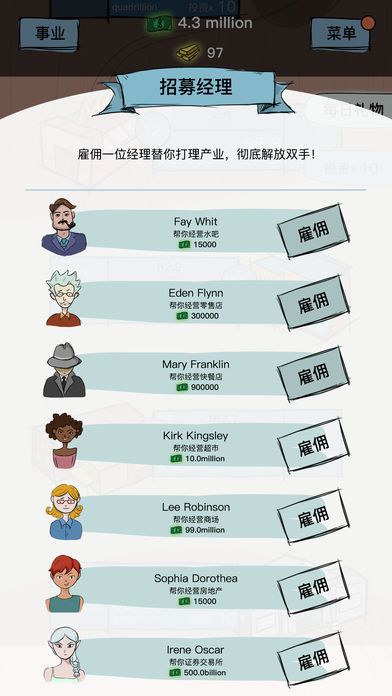 招募经理,雇佣一位经理为你打理产业,彻底解放你的双手。