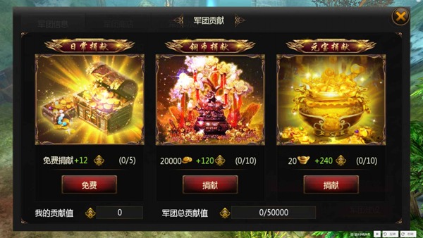 a)军团捐献分为免费捐献、铜币捐献、元宝捐献三种方式。