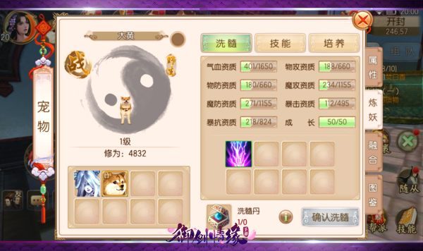 通过消耗不同道具,提升宠物的属性与等级。除经验培养外,每个宠物最多可培养10次。